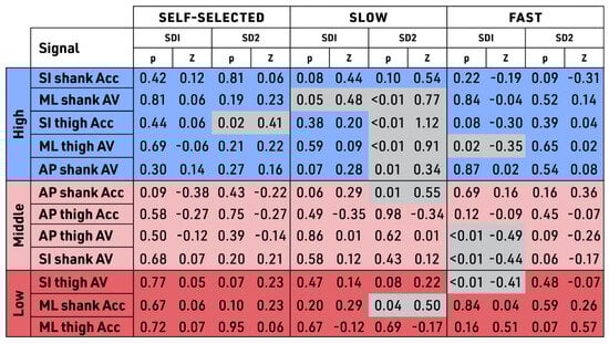 Poincare analysis: pairwise evaluation of similarity of treadmill versus outdoors (by SD1 and SD2). SD1 is short-term variability, SD2 is long-term variability with a significance level of p < 0.05, and Z score is shown. Tri-color banding similarity score color (non-grey) denotes similarity (signals with no significant difference for cosine and Euclidean distance for control vs. intervention groups). Grey denotes dissimilarity (significantly different cosine and Euclidean distance for control vs. intervention groups). Bands are shown as High, Middle, or Low based on the aggregate group data; Units: acceleration in meter per second square (m/s2); velocity in radian per second square (rad/s); Signals: Acc—acceleration, AV—angular velocity, AP—anterior–posterior, ML—medial–lateral, SI—superior–inferior; Speeds: self-selected, slow (−20%), fast (+20%).
