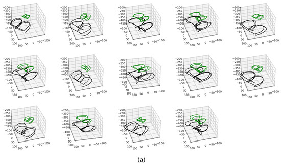 The variety in writing the letter B, as demonstrated by 14 experts, is illustrated in (a). The tip positions of the proximal and distal modules are represented in green and black, respectively. The experts exhibit distinct writing styles, as can be observed from variations in the size of the letter, the space covered, and the placement within the fixed scale of the axes. Figures (b–d) further demonstrate the distinct handling of the robot by the experts (as observed from the 14 experts) that contributes towards the diversity in the expert demonstrations. This figure is supported with Supplementary Materials Video S1.