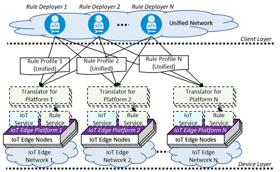 For operating the consistent rule-based service scenario without updating the existing IoT edge platforms, as shown in Figure 2, we propose the transparent rule enablement architecture that includes the proxy layer between client and device layers to bridge the rule deployers and platforms in heterogeneous IoT edge networks. The rule deployers are included in the client layer to access the IoT edge nodes that are included in the device layer. For using the same platform in both client and device, the rule deployer can directly deploy the consistent rule context to the nodes. However, interaction between different platforms requires the bridge to enable interoperability in the heterogeneous IoT edge networks.