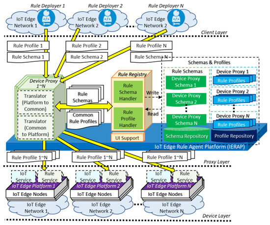 For enabling the transparent deployment and platform-specific translation to operate the consistent rule in heterogeneous IoT edge networks, the IERAP is proposed to provide corresponding interfaces to the client layer and delivers the rule knowledge to the device layer. Figure 3 presents the proposed IERAP architecture that is included in the proxy layer to bridge the client and device layer. In the proxy layer, the IERAP delivers the corresponding format of rules to the destination IoT edge platforms through the platform-specific protocol. The IERAP includes four parts which are device proxy group, rule registry, rule repositories and UI support. A device proxy is the entry of the IERAP that receives the schema and rule profiles through the platform-specific protocol and translates the platform-specific format of rule context to the common format. Also, the device proxy delivers the rule profile to the nodes through the platform-specific protocol based on translating the common format to platform-specific format.