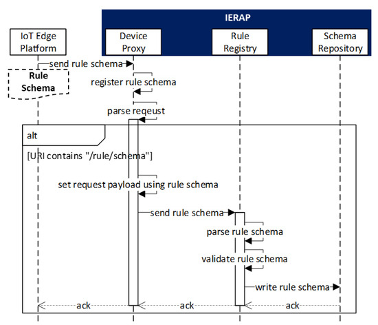 Figure 5 shows the sequence of the rule schema registration scenario through the interactions between IoT edge platform and IERAP.