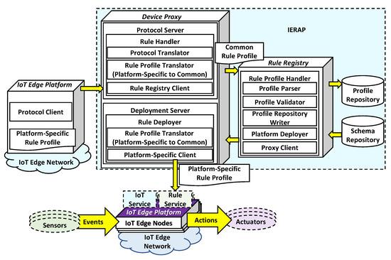 In the rule-enabled heterogeneous IoT edge networks, a rule context is difficult to deploy using a consistent interface to different platforms that are developed based on different IoT edge frameworks. Therefore, operating the consistent rule scenario in multiple platforms is difficult because the rule knowledge may be reduced according to the platform-specific requirement which constrains the properties in the rule profile. The proposed IERAP is deployed in the proxy layer to bridge the client layer and the device layer for deploying the consistent rule knowledge in heterogeneous IoT edge networks.