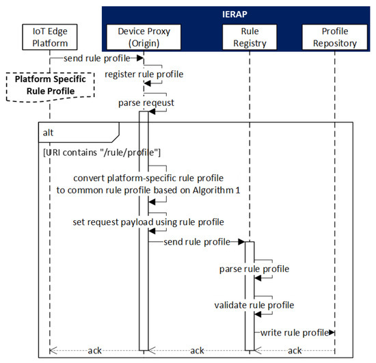 Figure 8 presents the registration scenario of the rule profile through the interaction between the IoT edge platform and IERAP.