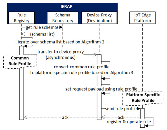 Figure 9 presents the scenario of rule profile deployment to the IoT edge platforms using the IERAP. Once the rule registry receives the rule profile from the rule deployer through the device proxy, the rule registry saves the profile to the repository and deploys the profile to the IoT edge platform based on the rule schema. Each schema is used for providing the reference of the corresponding IoT edge network. The rule registry retrieves the rule schema list from the repository and iterates over the schema list based on Algorithm 2. Inside of the iteration, also, the device list of a schema is iterated. In the iteration of the device list, the common rule profile is transferred to the device proxy that converts the common rule profile to the platform-specific rule profile based on Algorithm 3. Then, the converted rule profile is delivered to the IoT edge platform that operates the rule based on the platform-specific rule profile.
