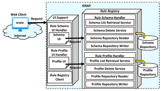 The UI support is a service provider that provides the UIs to the web clients. The web client application can work on web browsers to present the rule schemas and profiles. The UIs integrate the information of rule schemas and profiles with the delete function to handle each item of the retrieved list. For integrating the information with the UIs, the UI support sends requests to the handlers to obtain the information from the repository. Also, the delete function is presented with the identifier of a schema or profile to delete the selected schema or profile through the rule registry.