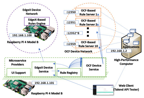 Figure 12 presents the network environment of the first scenario that deploys an OCF device service module in the Raspberry Pi 4 Model B device to perform the device proxy of the IERAP. As a device proxy, the OCF device service translates the rule profile from common style to the OCF-based platform-specific style and deploys to the OCF-based rule servers. The PC emulates 10 OCF-based rule servers for an OCF IoT edge network. Therefore, the OCF device service delivers the platform-specific style rule profile to these OCF platforms. The scenario is started by the web client that deploys the EdgeX-based rule profile to the device where the EdgeX device service receives the profile and translates it to the common format. Then, the device proxy delivers it to the rule registry. Based on the registered rule schema, the rule registry delivers the common rule profile to the OCF device service for deploying to the destination IoT edge platforms.