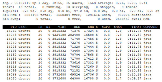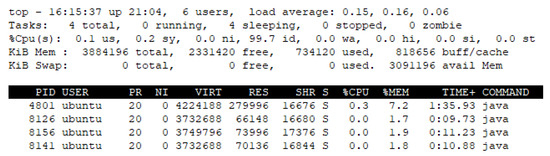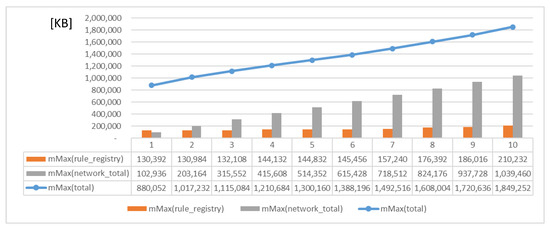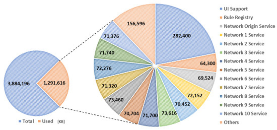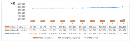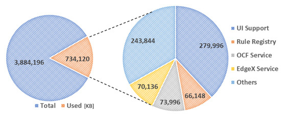 Figure 19 and Figure 20 present the memory usage of the IERAP for the experiment based on a single device proxy and multiple device proxies. For the single device proxy, the OCF service is performed to forward the rule profile to the network where the OCF-based IoT edge platforms are deployed. The Raspberry Pi device provides total memory of 3,884,196 KB. The device operates the IERAP that shares 490,276 KB for the single device proxy and 1,135,020 KB for the multiple device proxies.