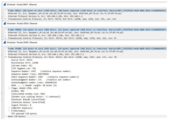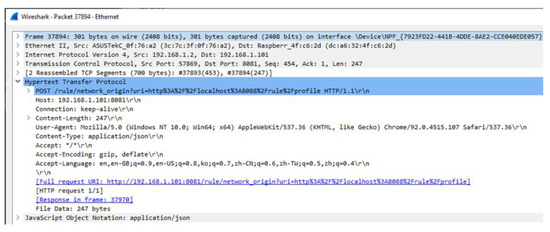 Figure 16 shows the implementation result of the rule profile deployment by the EdgeX-based rules engine to the IERAP. The result is collected using Wireshark that is a tool to capture network packets. The tool is configured in the Windows computer where the EdgeX-based rules engine is deployed and sends the EdgeX-based rule profile to the IERAP. In the IERAP, the EdgeX device service receives the rule profile and translates it to the common rule profile. The captured network packet includes the EdgeX-based rule profile that is 247-byte JSON data.