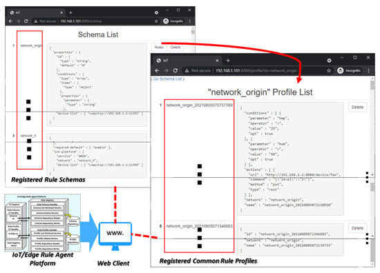 Figure 18 shows the implementation result of the client service that is provided by the UI support of the IERAP. For presenting the registered rule schemas and profiles, the UI support interacts with the rule registry internally based on microservices. The UI support includes the UI resources that are used for integrating the information of the retrieved rule schemas and profiles and delivered to the web client such as web browsers. Firstly, the schema list is included in the UI and presented to the users. In the list, clicking the item retrieves the rule profile list of the corresponding IoT edge network. Each item includes a function to delete it from the list. Also, by including more functions, the IERAP can provide a rich user experience to manage the rule schemas and profiles.