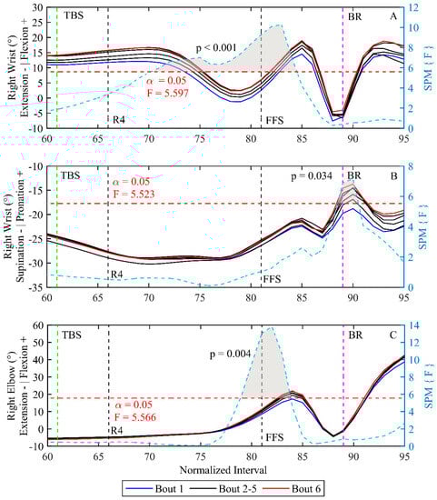 Shows mean angles for all participants throughout bouts. Bout one is blue, with bouts in-between being black and bout six is red. Black vertical lines are mean heel contact of right (R4) as the fourth step and FFS as the left and last step of the bowling delivery. Green and pink lines represent TBS and BR, respectively. SPM1D analysis is inserted onto the figure as a dashed blue line; the critical threshold is presented as a horizontal red dashed line, with an alpha value of 0.05 and a corresponding F-value. Clusters of significant differences are marked with grey and a p-value. Be aware that the statistics show within subjects, whereas the bouts are an average of all subjects; further SD values are omitted for clarity. (A) Flexion/extension of the right wrist. (B) Pronation/supination of the right wrist. (C) Flexion/extension of the right elbow.