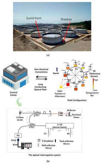 A practical problem of temperature uncertainty existed in oil-tank GS monitoring due to sunlight irradiation on a large cylindrical structure of the oil tank. In this case, an oil tank with 100,000 m3 in its capacity bears a diameter of 80 m and a height up to 21.8 m. A large temperature difference can be produced between the regions in the sunlit front and those in the shadow, as indicated in Figure 1a. In summer, this difference can exceed 30 °C, which is measured by the distributed Raman temperature sensor (HG-DTS-160, from Tianjin Huigan Optoelectronic Technology Co. Ltd., Tianjin, China. The range is −40 °C~+100 °C, with a temperature accuracy of ±1 °C and a resolution of 0.1 °C. It is the temperature difference that causes the uncertainty in the results of oil-tank GS. In optical temperature measurement, many methods have been proposed, such as liquid-filled photonic crystal fiber [17], blackbody radiation sensors [18], fluorescence-based sensors [19], etc. [20]. However, the most commercial and wide-used in oil tank monitoring is the distributed Raman temperature sensor, which can be found in market.