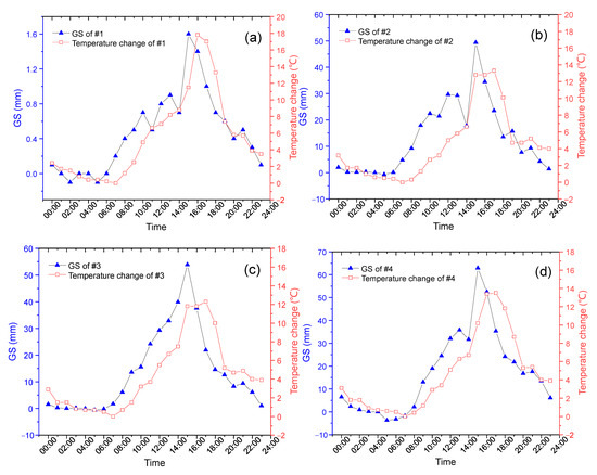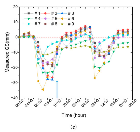 Two curves of GS measurement and temperature changes were plotted in one figure for comparison. The GS results were recorded by GS sensors and the temperatures by the distributed Raman fiber temperature sensor. The GS information and the temperatures were simultaneously interrogated and were presented in Figure 2.