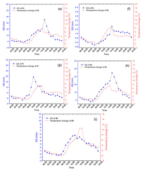 The fluctuations in oil-tank GS results compared with their environmental temperature changes. (a–i) represent the results of sensor #1 to sensor #9, respectively.