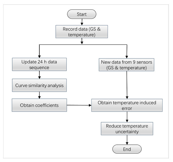 Firstly, the coefficients are calculated according to Equation (5) based on a continuous 24 h practical acquisition of GS and temperature simultaneously. All the data were acquired in a one-hour interval, so 24 data were collected from each sensor per day. A CSA algorithm is developed based on these recorded data, and the predicted temperature uncertainty can be figured out as the coefficient multiplied by the temperature changes, and that is . Thus, the temperature uncertainty can be subtracted from the practical GS results, , underlying the relationship given by Equation (6) as:
