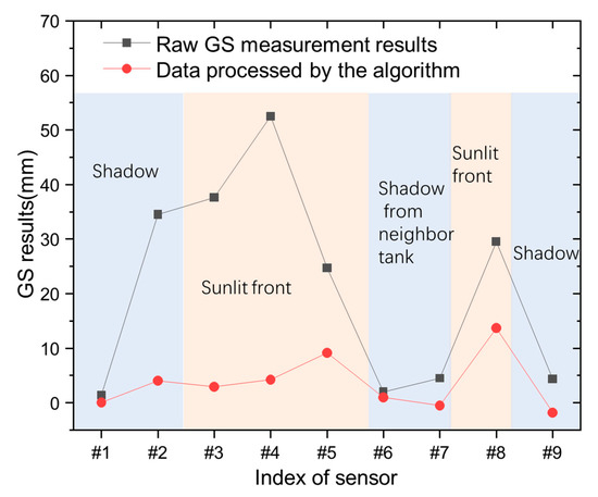 In Figure 6, from the raw GS measurement, it can be observed that the significant fluctuation in GS can reach above 50.0 mm! That can be attributed to the nonuniform temperature field for different sensor locations between the sunlit front and shadow described above. Then, the proposed algorithm can reduce the temperature uncertainty and make the GS sensor work well under such a large temperature difference. It can be seen that sensors #3, #4, #5, and #8 are in the sunlit front area, sensors #1, #2, and #9 are in the shadow, and sensors #6 and #7 are in the shadow of a neighboring tank, considering the location illustrated in Figure 1b. When the temperature rises, the liquid expands. In addition, it makes the liquid level rise, therefore, leading to a large readout fluctuation. The larger temperature fluctuation, the larger the fluctuation in GS measurement. That is the reason for a large fluctuation in the measured data.