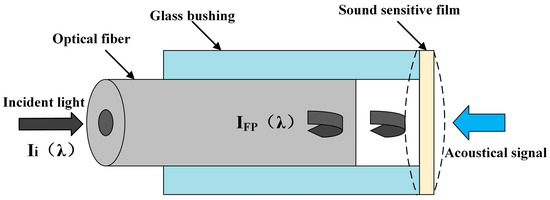 The basic principle of an EFPI-type fiber-optic acoustic pressure sensor is to use light as the transmission medium of acoustic wave information, detect the small deformation of the sensitive structure caused by the acoustic wave signal with light, and then restore the acoustic wave signal into an electrical signal through optoelectronic conversion to realize the function of acoustic wave sensing [9]. It includes the three links of acoustic wave to diaphragm mechanical vibration conversion, diaphragm mechanical vibration to interference light intensity conversion, and optical signal to electrical signal conversion. The current EFPI-type fiber-optic acoustic pressure sensor mainly uses various types of diaphragm inner surfaces and fiber-optic end faces to form the two reflective surfaces of the F-P interferometer [10]. When the external acoustic pressure signal acts on the diaphragm, resulting in a small deformation, which leads to changes in the length of the F-P cavity, which in turn causes a change in the interferometric spectra.