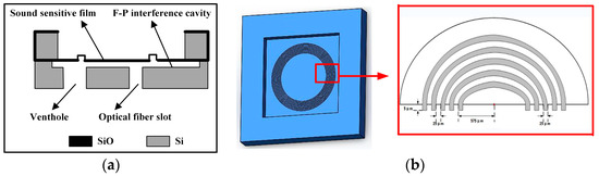 In this experiment, the MOEMS chip is fabricated using bulk-silicon micromachining technology, which uses reactive ion etching (RIE) technology and deep reactive ion etching (DRIE) technology to design the optical F-P chamber and the core acoustic pressure-sensitive structure film of the sensor [12]. Finally, wafer-level bonding technology is utilized to realize the high-precision alignment of the two aligned integrations, which greatly improves the consistency of the sensor. As shown in Figure 2a, the etched silicon forms ventilation holes to meet the air pressure balance between the two sides of the acoustic pressure-sensitive film. The design of the fiber-optic grooves can achieve self-alignment and limitation, and the fiber-optic inserts can be directly inserted to reduce the errors caused by the manually produced encapsulated sensors and improve the efficiency of mass production.