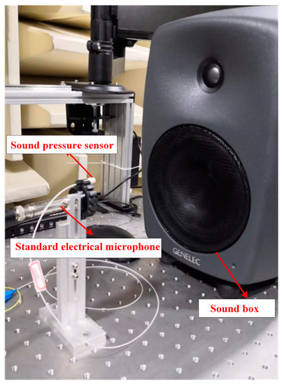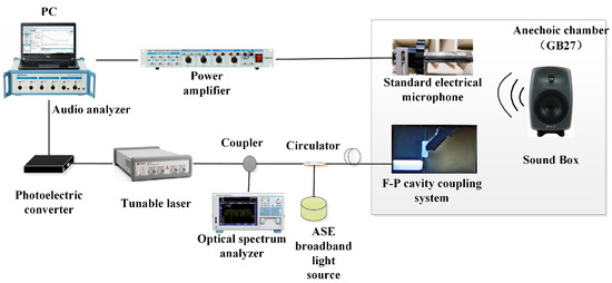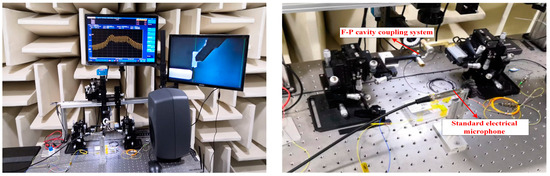 The setup of the real-time coupled acoustic test experimental system is shown in Figure 4; to avoid external noise interference, a condenser microphone (ABTEC, AX-MC01) with a sensitivity of 45 mV/Pa was used as a reference throughout the process in a semi-anechoic chamber (ABTEC, GB27) environment. The F-P cavity coupling system and the reference condenser microphone were kept at the same distance from the loudspeaker (GENELEC, SAM8040), and were all symmetrically located along the center axis of the loudspeaker to ensure consistent sound pressure measurements. The sound source was set up by an audio analyzer to emit a standard sinusoidal signal with a frequency of 1 kHz [19]. An amplified spontaneous emission (ASE) source with a center wavelength of 1550.12 nm and a spectral width of 40 nm was used as the light source, and the light was injected into the F-P cavity coupling system via a circulator. In order to minimize the potential impact of changes in environmental factors on the sensor’s performance, the ambient humidity was controlled between 40% and 60%, and the sensor and standard microphone were placed on a heated platform (MTI-3040) with the temperature set at a constant level throughout the test. In addition, the system used a three-wavelength adaptive intensity demodulation algorithm, which had a better demodulation effect under the drastic temperature change environment, and could effectively minimize the influence of the sensor working point drift caused by the temperature change.