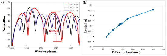 The different lengths of the F-P cavity under the part of the reflectance spectral map and the cavity of optical loss with the length of the change rule are shown in Figure 8. The optical loss of the whole cavity increases with the increase in F-P cavity length, and the FSR and the contrast of the interferometric light intensity spectrum in the interference spectrum decrease, which is in line with the theoretical results.