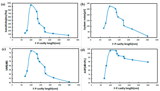 The four types of acoustic indicators measured with the F-P cavity length change rule are shown in Figure 9. After the optimal initial cavity length, and with the increase in F-P cavity length, the acoustic performance of the sensor gradually deteriorated, and only achieved the optimal performance value in the optimal initial cavity length or so.