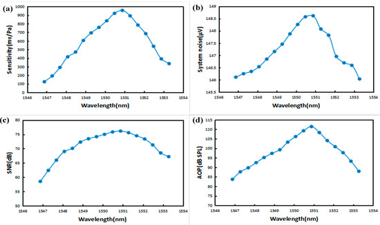 In the experiment, the cavity length of the F-P cavity coupling system was still adjusted to the optimum initial cavity length state, and the incident light power of the light source was approximately 1.5 mW. In the wavelength range of 1547~1553 nm, with the increase in the incident light wavelength, the sensitivity of the sensor, the bottom noise of the system, the SNR, and the AOP have a maximum value in this wavelength range, and the optimal input wavelength is 1550.88 nm, as shown in Figure 12.