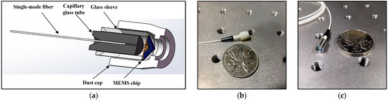 Figure 13a illustrates the schematic structure of the EFPI fiber-optic acoustic pressure sensor based on the MOEMS’s sensitive structure, which consists of four parts: a single-mode fiber core, a glass sleeve, a MOEMS chip, and a dust cap. Figure 13b shows the physical diagram of the sensor fabricated by using a 5-ring chip. Figure 13c shows the optimized sensor using a 9-ring chip.