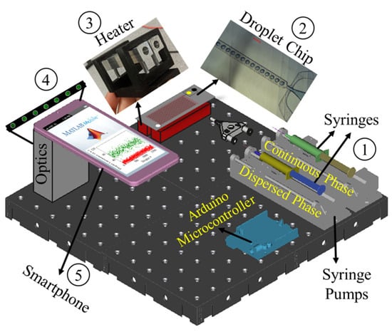 We employed our previously developed direct 3D printing approach to create our droplet generator microfluidic chip [33]. The 3D model of the droplet generator chip was made in FreeCAD. Special care was taken to position the microfluidic channels between 1–4 slice layers beneath the chip surface, which mitigated the risk of curing any liquid resin trapped within the channels during the UV exposure process. The channel cross-section was specifically fixed at 200 × 200 microns for the droplet generator design, especially in the flow-focusing section, to ensure optimal droplet generation. The CAD file was then sliced in Prusa slicer software (version 2.3) and uploaded to the SLA printer (Prusa SLS). After printing, we employed compressed air to effectively expel any uncured liquid resin trapped inside the microfluidic channels through the designated inlet and outlet ports. Once air-dried, the chips were subjected to a final curing phase in the Prusa curing station (CW1S) for one minute. This created a functional droplet generator microfluidic chip, with the entire fabrication process spanning approximately 2 h. To authenticate the dimensions of these microfluidic features, we used a brightfield optical microscope (Leica fluorescence microscope; magnification range of 10–100×) to capture high-resolution images. The ToupView software (Ver. 3.7), a specialized microscope image analysis tool, facilitated the precise quantification of the defined length scales and other microfluidic attributes pertinent to droplet generation. The syringe pumps employed in this study are New Era NE-102X models, which operate on a 12 V DC power supply and draw a current of 1000 mA. In the current configuration, the syringe pumps operate on a DC power supply sourced from a wall outlet. However, it is feasible to replace this with a 12 V battery pack to enhance the system’s portability.