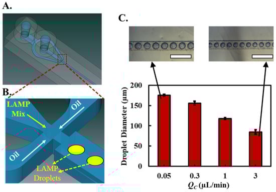 To circumvent this, we utilize our previously developed method for 3D printing microfluidic chips that enables one to fabricate a complete microfluidic chip using a single CAD file in less than 2 h without needing photolithography or tedious chip bonding steps [33]. Briefly, the fabrication technique uses a custom resin formulation with a desktop stereolithography (SLA) based 3D printer to fabricate microfluidic chips reliably and rapidly with embedded channels. The inlets and outlets are interfaced with nylon tubing to facilitate liquid flow with external syringe pumps. With this technique, we fabricated a microfluidic chip (Figure 2A,B) with a flow-focusing droplet generation segment using oil (as the continuous phase) and LAMP assay mix (as the dispersed phase). Once formed, the continuous phase propelled aqueous LAMP assay droplets through 15 serpentine channels (Supplementary Materials, Figure S1). This layout ensured that each droplet’s residence time could be modulated between 10–100 min, contingent on the continuous phase’s flow rate. Our findings indicate that, at a set dispersed flow rate (QD = 5 μL/min), manipulating the continuous phase’s flow (QC) rate permits control over droplet size (Figure 2C). By increasing the continuous phase’s flow rates, droplet sizes can be reduced. Extremely low values of Qc lead to droplets reaching their maximal potential size, constrained by channel dimensions, at approximately 200 microns. Conversely, higher Qc values result in droplets with smaller diameters, approximately 100 microns. Impressively, the variation in droplet size was observed to be less than ±5 microns across all droplets synthesized using our chip.