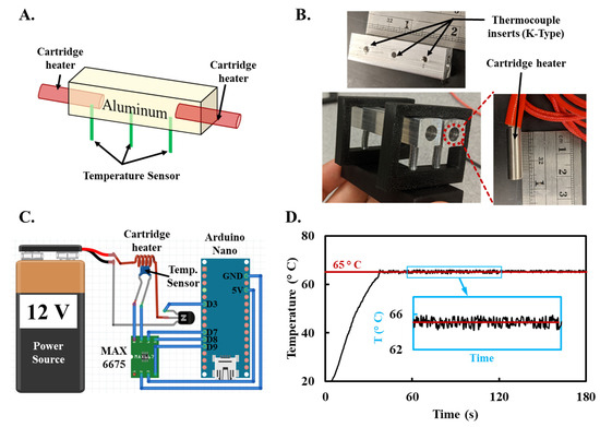Engineering and performance evaluation of the low-powered heating blocks (A). Schematic representation of the machined aluminum heating blocks integrated with two heating cartridges (B). Assembled heating blocks comprising of spring-loaded machined aluminum blocks, cartridge heater, and holes to insert the thermocouple. (C). Circuit diagram detailing the Arduino-controlled heating module. (D). Performance assessment showing rapid attainment of the desired 65 °C setpoint, with deviations not exceeding ±0.8 °C from the setpoint.