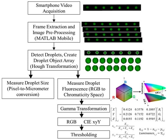 The image analysis workflow flowchart is presented in Figure 4 and starts with a video capture of continuously flowing droplets with the camera ISO and exposure kept constant. A recording duration of 30 min is chosen to ensure comprehensive capture of all droplets in the microfluidic flow. Post-recording, the image analysis is conducted using MATLAB Mobile, which facilitates extracting individual frames from the video. Once extracted, these image files, representing the RGB channels, are uploaded directly to the MATLAB online drive for automated processing. In the preprocessing phase, each image color channel undergoes Gaussian noise reduction by spatially averaging pixels based on proximity and intensity similarity, effectively reducing any random noise. Subsequently, a median image of all frames is computed and subtracted from each frame. This background subtraction technique emphasizes the droplets against a consistent and uniform background. For droplet detection, the Hough transformation—a robust technique for circle detection—is employed, which identifies the circular shapes of droplets by transforming the image space into a parameter space. Following detection, morphological operations, specifically erosion, and dilation, refine the boundaries of the droplets. Each detected droplet is stored in an object array containing RGB pixel values. This organized array is subsequently passed to dedicated functions for each droplet’s size and fluorescence intensity measurements. The size of the droplets is determined through a pixel-to-micrometer conversion corresponding to the largest chord of the droplet geometry. For fluorescence measurement, we utilize our previously developed RGB to CIE-xyY transformation to enhance the quantification of the captured fluorescent signals This transformation process separates the color and intensity of RGB pixels to produce luminance values with a higher dynamic range [37,38,39,40,41]. Briefly, a gamma transformation is applied to the RGB values, correcting for the non-linear response of the sensor’s pixel intensity values. These corrected values are then processed through the Direct Linear Model, converting them into device-independent CIE XYZ tristimulus values normalized to yield each RGB pixel’s luminance and chromaticity values. The derived luminance discrimination (L) metric quantifies the fluorescence signal’s strength, independent of color. Lastly, in the droplet categorization phase, a thresholding technique is employed. This method determines the luminance cutoff that differentiates between a positive droplet and a non-positive one, ensuring accurate and reliable results in the analysis of droplets in the microfluidic chip.