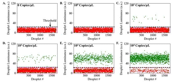 In contrast, droplets with diminished luminance, indicative of negative results, were rendered in red. A discernible clustering pattern emerged in the luminance space (Figure 5). Positive and negative droplets appeared to congregate around distinct luminance values, with a conspicuous gap separating the two clusters. As hypothesized, the droplets from the negative control exhibited dim fluorescence, corroborated by the diminished luminance values, thereby signaling a negative result (Figure 5A). Conversely, the positive samples between 101–104 copies/μL produced several droplets exhibiting pronounced luminance values, indicative of anticipated positive outcomes (Figure 5C–E). As the DNA concentration increased, there was a corresponding rise in the proportion of positive droplets. This trend is due to the higher chance of droplets containing the target DNA at elevated concentrations, increasing the fraction of positive droplets. The sample with 1 copy/μL did not result in positive droplets (Figure 5B), suggesting the limit of detection of the proposed system is 10 copies/μL, which aligns with other ddLAMP systems [18,23].