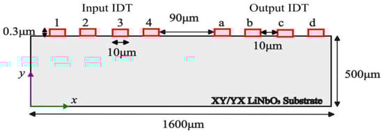 The 2D computational model of XY LiNbO3 used for the verification study is represented in Figure 1. A LiNbO3 substrate with dimensions of 1600 µm × 500 µm was used in the initial study. The input and output ports consisted of two-finger pairs of aluminum IDTs with dimensions of 0.3 µm thick and 10 µm wide with a pitch of 10 µm. The input and output IDTs were named “1”, “2”, “3”, and “4” as well as “a”, “b”, “c”, and “d”. The chosen periodicity of IDTs was 10 µm (λ/4) where the wavelength (λ) was equal to 40 µm. The active area for the microfluidic channel was between the input and output IDTs with a width of 90 µm. The aforementioned computational domain was based on the previously published report [26].