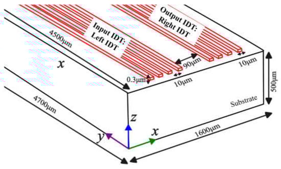 The 3D computational domain chosen was similar to the 2D domain with overall dimensions 1600 µm × 500 µm × 4700 µm as depicted in Figure 2. The longer length of the electrode of 4500 µm was selected, with a thickness and width of 0.3 µm and 10 µm, respectively. The reason for selecting a higher length-to-width aspect ratio was to study the wave formation and reduce the amplitude along the length of the electrode, along with creating a near 50 Ω resistance needed for impedance matching. Here the input IDT and output IDT are also referred to as the left and right IDTs, respectively. All other dimensions remained identical to the 2D domain. The total active area under the influence of acoustic waves was 90 µm × 4500 µm.