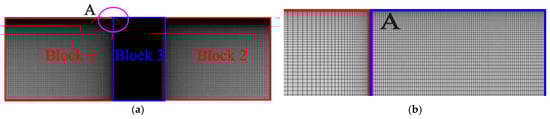An example of the 2D computational mesh with a zoomed view of area “A” close to IDT is shown in Figure 3a,b. The finer mesh was applied near the surface of the IDT to capture the surface wave utilizing quadrilateral mesh. Also, the finer mesh was used in a region, “block 3”, which consists of active area and IDT as represented in Figure 3. The 2D mesh details are provided in Table 1. A similar finer mesh was utilized for the 3D domain by keeping 40 elements per wavelength near the IDT.