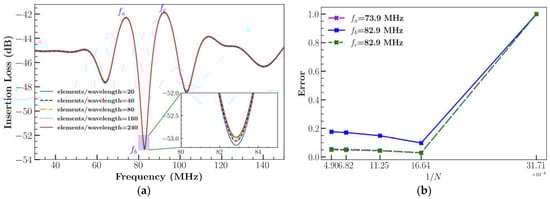 IL is calculated by using Equation (10) with time step = 0.1 ns with a total simulation time of 100 ns and impulse condition from Equation (9). The results are represented in Figure 4a for different cases (Table 1). The normalized error was calculated for 2D XY LiNbO3 at various frequencies using the L2 norm (Equation (8)) with respect to different total number of elements as shown in Figure 4b.