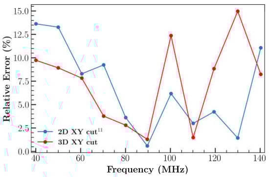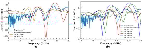 Further FEM analysis was extended to 3D cases with different orientations and cuts: 3D XY LiNbO3, 3D YX LiNbO3 and 3D YX 1280 LiNbO3. The results are illustrated in Figure 5a,b. Compared to the 2D XY cut, the 3D XY cuts of LiNbO3 results were in good agreement with the experimental outcomes [26] (Figure 5a). The addition of the extra dimension (length) to the model resulted in enhanced IL, which is in good agreement with previous results [31]. However, results of IL differ at higher frequency. This could possibly be caused by the number of elements considered for IDT, the time step, the diffracted waves produced by IDT boundaries due to available computational resource limitation. This demonstrates that the wave formation in the third direction influences the device’s performance. Figure 5b represents the comparison of simulation and experimental results of different orientations of LiNbO3. 3D XY cut LiNbO3 model captures a better result than a 2D model in most of the frequency locations as represented in relative error comparison plot Figure 6 with the experimental result.