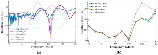 A parametric study was conducted to investigate the impact of electrode thickness on IL by utilizing the 3D XY LiNbO3 model. The impact of the electrode thickness on IL was represented in Figure 7a. A lower frequency shift was observed due to the increment in the thickness of the electrode. In addition, Figure 7b illustrates the relative error of IL. A significant increase in IL was determined at frequencies > 100 MHz for thick (5 μm) electrodes, which is believed to be due to the increased mass. A 0.5 μm electrode thickness was selected for all future simulations due to the reduced error.