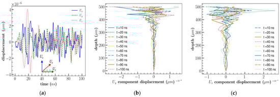 Simulation results of 3D XY LiNbO3 (a) displacement components with respect to time, at location (x = 800 µm, y = 200 µm, z = 500 µm); (b) Uy; (c) Ux displacement component along the depth at location (x = 800 µm, y = 200 µm).
