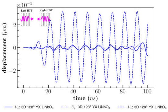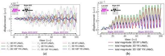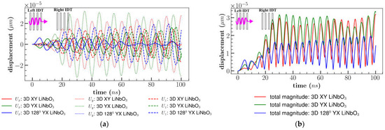 Different orientations of the 3D model of LiNbO3: (a) XY cut, (b) YX cut and 1280 YX cut were subjected to the peak-to-peak continuous sinusoidal voltage of 1 V and frequency of 100 MHz applied at left IDT only (Figure 2). This subsection was referred to as single direction or traveling SAW (tSAW). IL and displacement components (perpendicular to propagation direction) were analyzed in the material coordinate system (X, Y, Z) and represented in Figure 9a,b at the same location (800 µm, 200 µm, 500 µm).