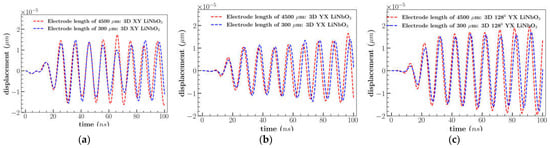 Comparison of Uz displacement for (a) XY; (b) YX; (c) 1280 YX cut LiNbO3 of electrode length of 4500 µm and 300 µm.