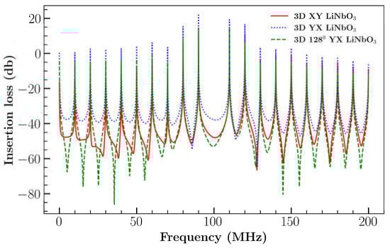 The total magnitude was highest for YX cut (average of 3 × 10−5 µm) due to the large displacement of the Uy component (Figure 9b). On the other hand, the 1280 YX cut had the lowest total magnitude because of the low Uy component but 1280 YX had the largest Uz displacement with an average peak of 1.8 × 10−5 µm (Figure 10c). Figure 11 represents the comparison of IL between LiNbO3 orientation. IL was found to be minimum for YX cut with a range from 22 dB to −66 dB in comparison with YX cut 1280 LiNbO3 (range: 14 to −86 dB) and XY cut LiNbO3 (range: 14 to −65 dB).