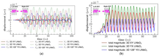 Comparison of (a) displacement components; (b) total displacement magnitude for different orientation of LiNbO3 combining multiple waves.