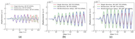 Simulation results of out-of-plane (Uz) displacement considering cases single direction, bi-direction and bi-direction (wave delay) for (a) XY, (b) YX, and (c) 1280 YX cut LiNbO3.