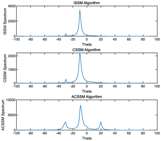 Assuming a uniform linear array with eight elements, the incident angles of the sources in space relative to the array are θ1 = −30°, θ2 = −10°, and θ3 = 20°. The frequency of the impinging signals ranges from 500 to 1700 Hz, and the signal-to-noise ratio (SNR) is 10 dB. The sensor spacing is set to a half-wavelength corresponding to the highest frequency. The samples of the impinging signal are divided into L = 10 segments, each containing P = 256 samples. In each segment, 256 samples are transformed into the frequency domain using a 256-point DFT. DOA estimation is performed using three different algorithms: (i) ISSM; (ii) CSSM (with initial DOA estimates of −30°, −10°, and 20°); and (iii) ACSSM. Using the ACCSM algorithm, 1100 Hz is used as the reference frequency f0 and the focus matrix at different frequencies was constructed using Equation (11). Equation (12) is used to obtain narrowband data at different frequencies, facilitating the estimation of DOA. As shown in Figure 1, it can be observed that the ISSM algorithm and CSSM algorithm only exhibit significant peaks at −30° and −10°, while the peak at 20° is not prominent. On the other hand, the ACSSM algorithm shows peaks in three directions, indicating accurate DOA estimation results.