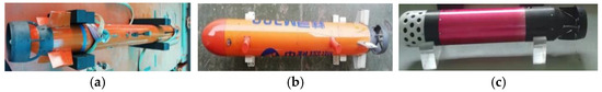 The pictures of AUVs. (a) AUV #1; (b) AUV #2; (c) AUV #3.