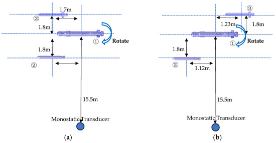 During the testing process, with the aim of enabling underwater communication between multiple AUVs and the formation control of AUVs [3], the three targets were arranged in two different formations for the analysis of echo characteristics: the triangular formation and the diagonal formation. For AUV #1, a 360° rotation was performed to determine the DOA of the target at different attitude angles, allowing the comprehensive analysis of echo characteristics. On the other hand, AUV #2 and AUV #3 maintained fixed positions throughout the experiment. During the test, all three targets were positioned at a depth of 9 m. The layouts of the formations, from a top-down perspective, are illustrated in Figure 3.