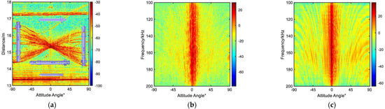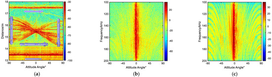 In the triangular formation, the distance-angle spectrum for the echo beamforming at different azimuth angles of AUV #1 (relative to the transducer’s incident angle) is shown in Figure 7a–c for the −45°,0°, and 45° attitude angles, respectively.