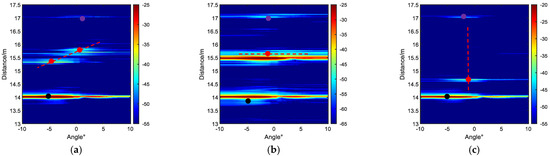 Distance-angle spectra for the two-dimensional distribution of highlights at different attitude angles. (a) −20°; (b) 0°; (c) 90°. (The red dashed lines represent the attitude status of AUV #1, the black dots and purple dots represent the echo highlights of AUV #2 and AUV #3, respectively).