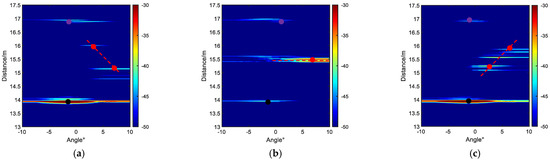 Distance–angle spectra for the two-dimensional distribution of highlights at different attitude angles. (a) −45°; (b) 0°; (c) 45°. (The red dashed lines represent the attitude status of AUV #1, the black dots and purple dots represent the echo highlights of AUV #2 and AUV #3, respectively).