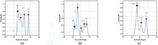 Spatial spectrum estimation of diagonal formation at different attitudes. (a) −20°; (b) 0°; (c) 90°. (The red arrows represent echo highlights from AUV#1, the black and purple arrows represent the echo highlights received from #2 and #3).